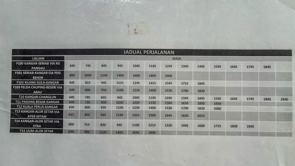 O primeiro problema do dia surgiu com a chegada tardia do ônibus e, em vez de pararmos no destino às 14h30, vimos a placa de Kangar apenas às 15h45. Agora era esperar o T11, ônibus de linha que nos levaria à fronteira, previsto para as 16h30.