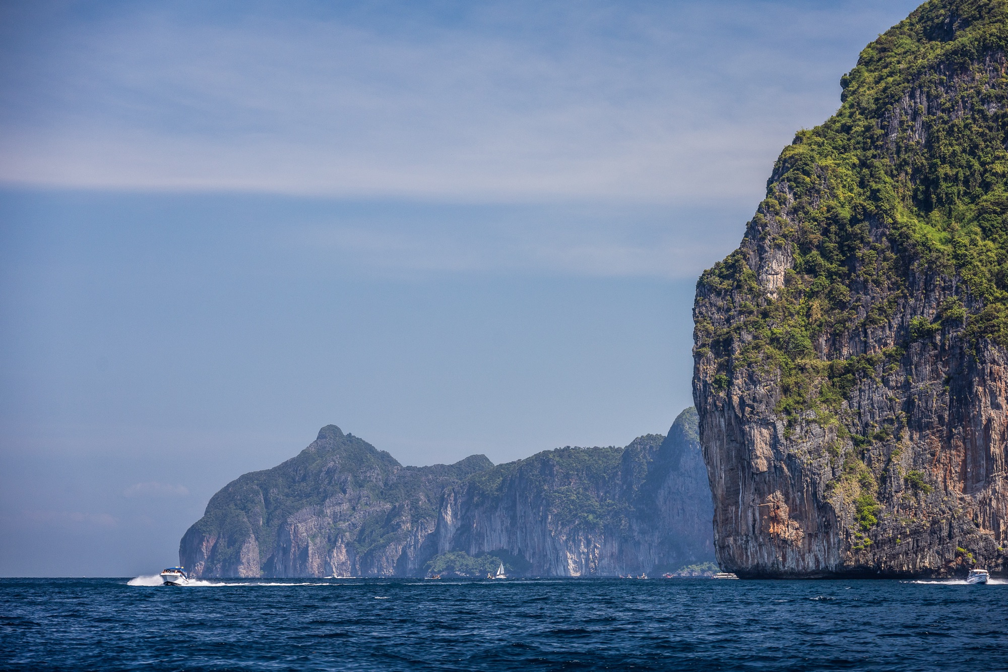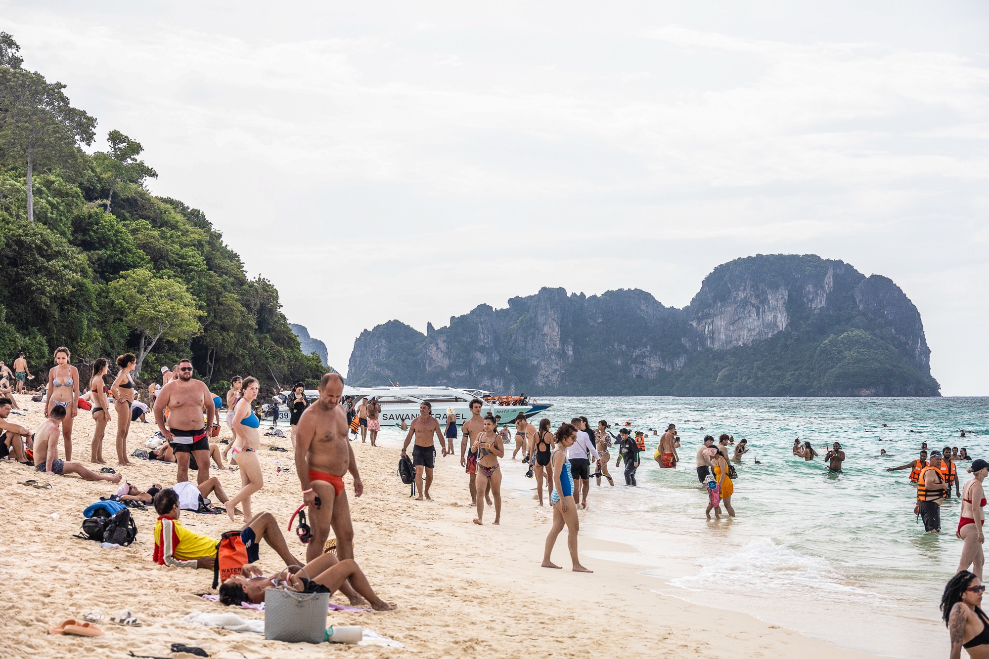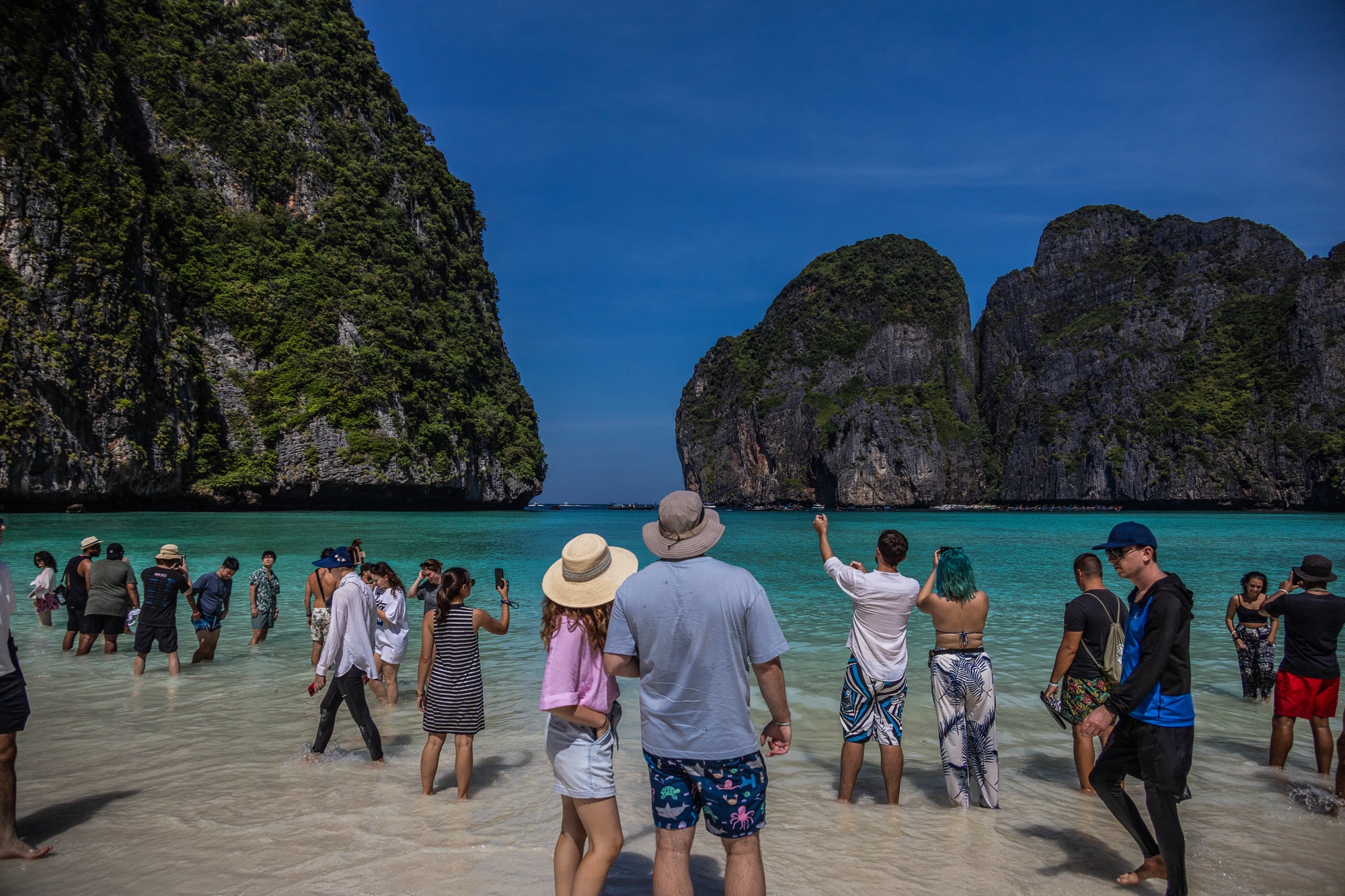 A praia é realmente muito bonita. E cheia. Com o sucesso do filme, o lugar chegou a receber 8.000 pessoas por dia e, diante do estrago de tanta gente, autoridades tailandesas proibiram a visitação de 2018 a 2022, para a reabilitação da vida marinha. Agora, há uma área onde barcos não entram e o visitante também não pode se banhar, só molhar os pés. Por volta das 11h de uma manhã de novembro, era possível achar uma brecha na água para garantir a foto com a baía de fundo —segundo o guia, Coco, em dezembro vai ter muito mais turistas ali.