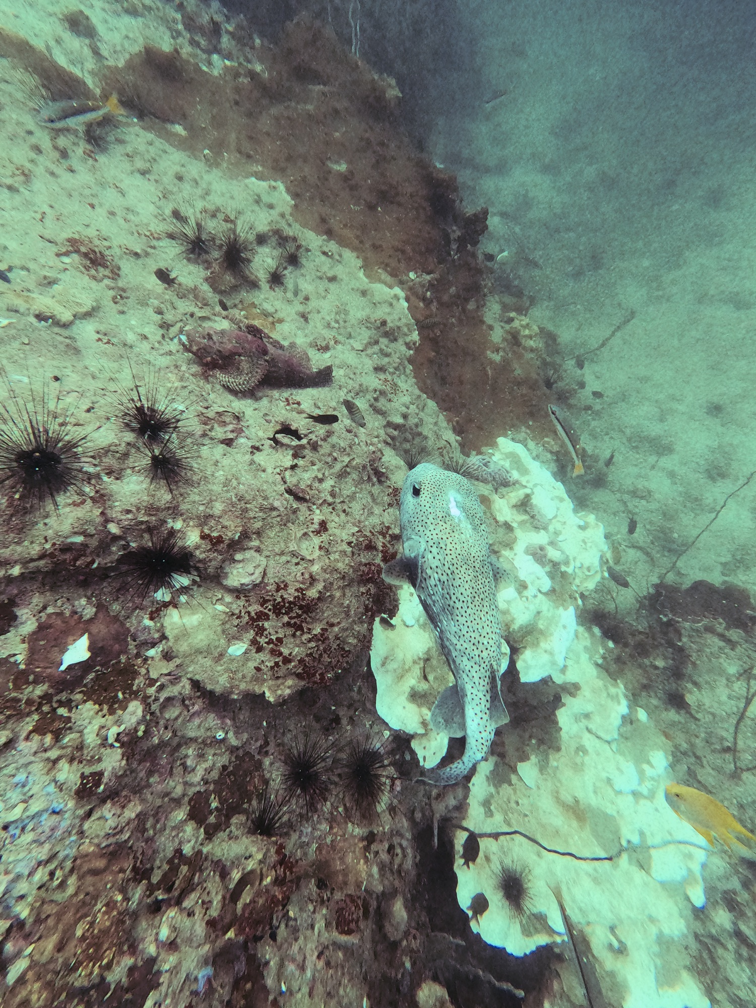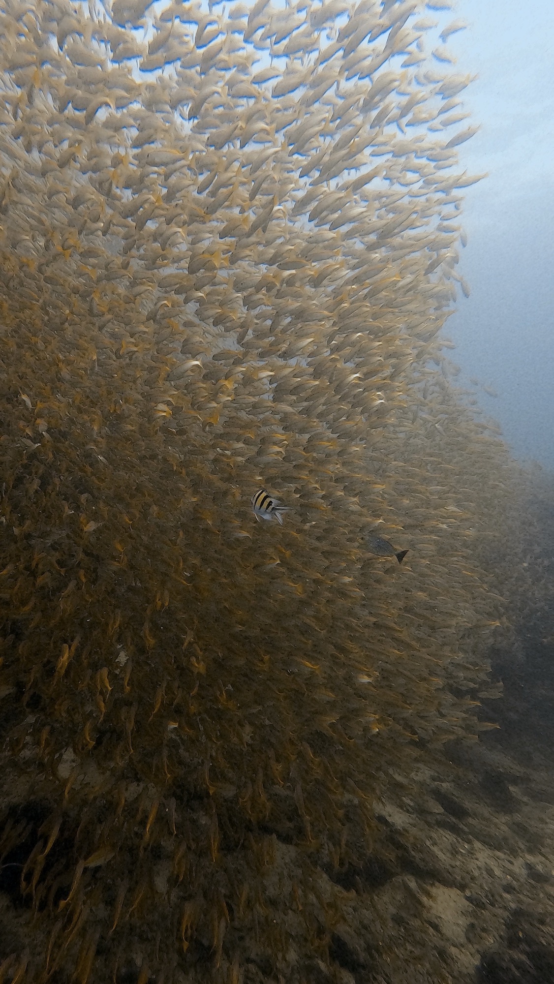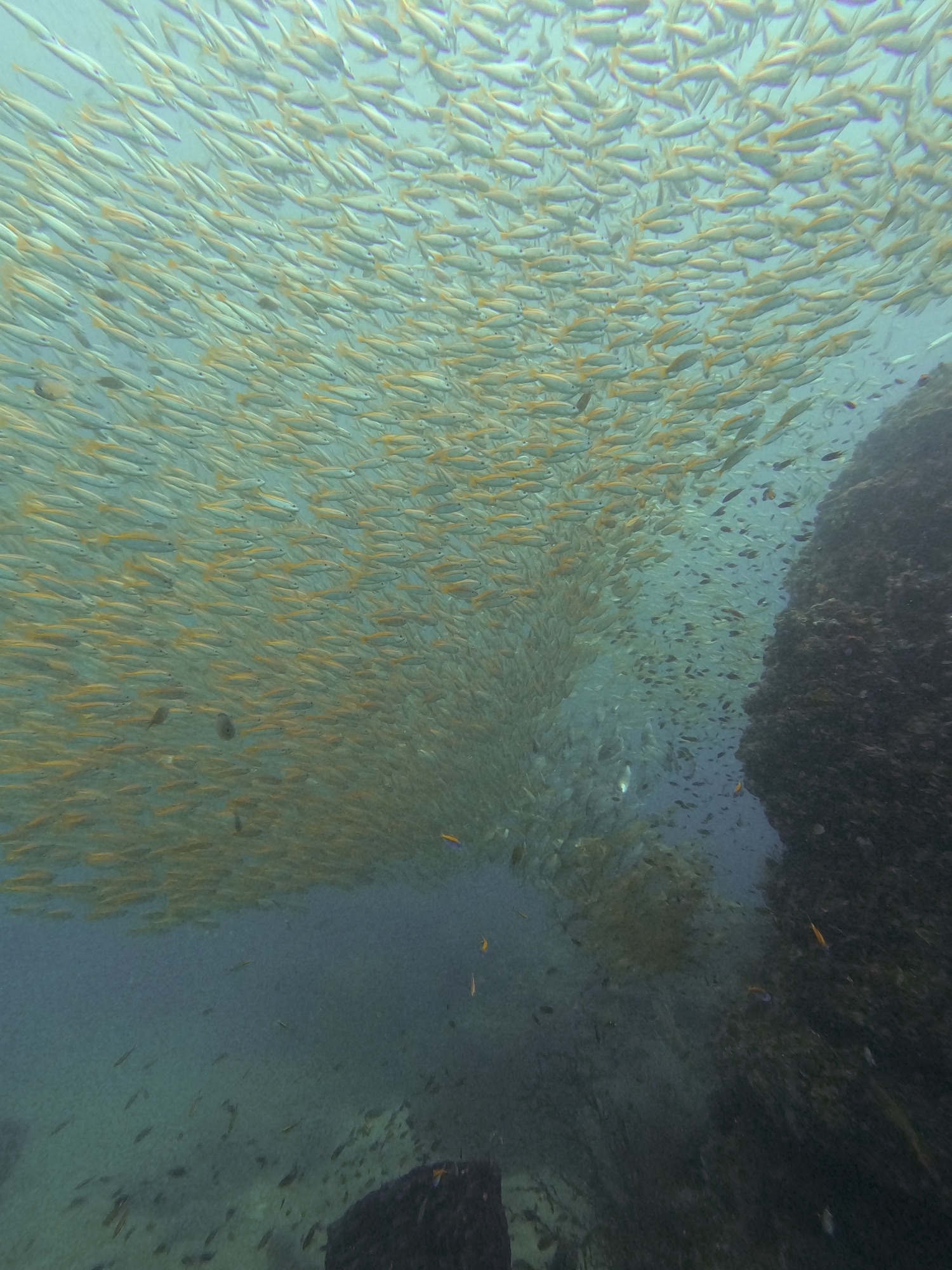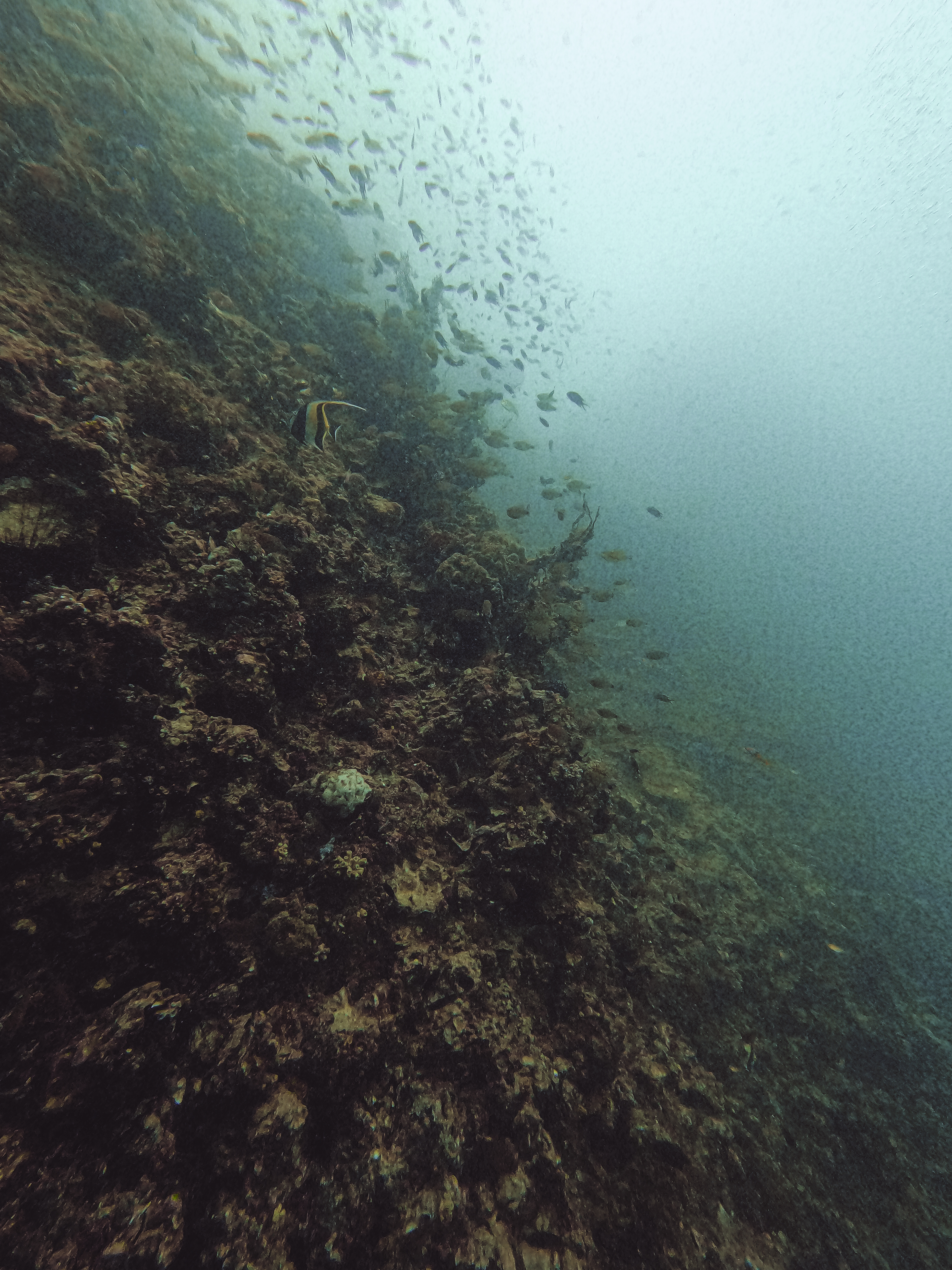 O destino do barco varia de acordo com o dia da semana e preferimos ir para Koh Phi Phi e o Shark Point —entre as opções, há bastante saída para Koh Racha Yai. No fim, a forte correnteza fez o mergulho no ponto dos tubarões ser alterado para Koh Doc Mai, que serviu de proteção para a maré.