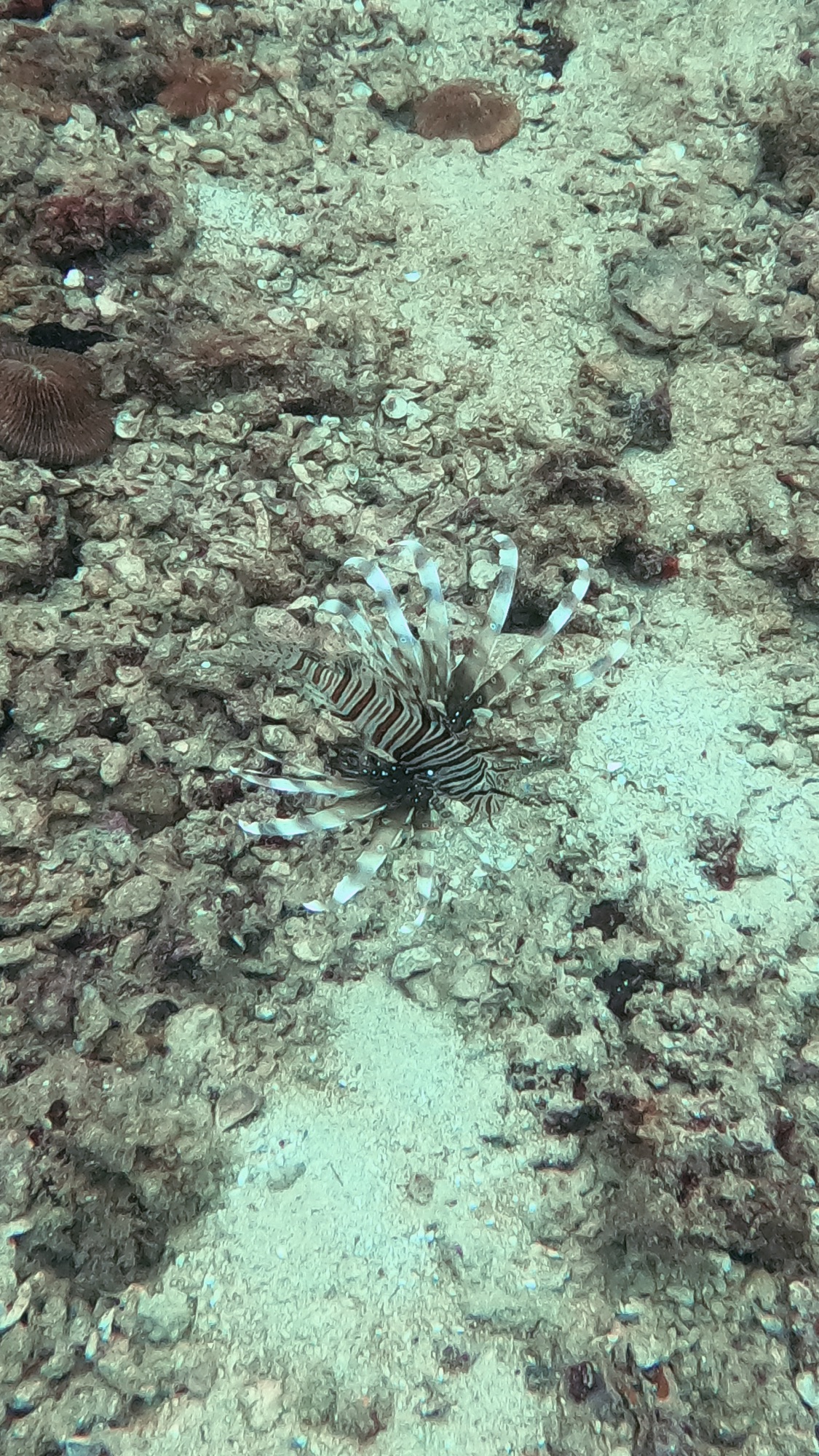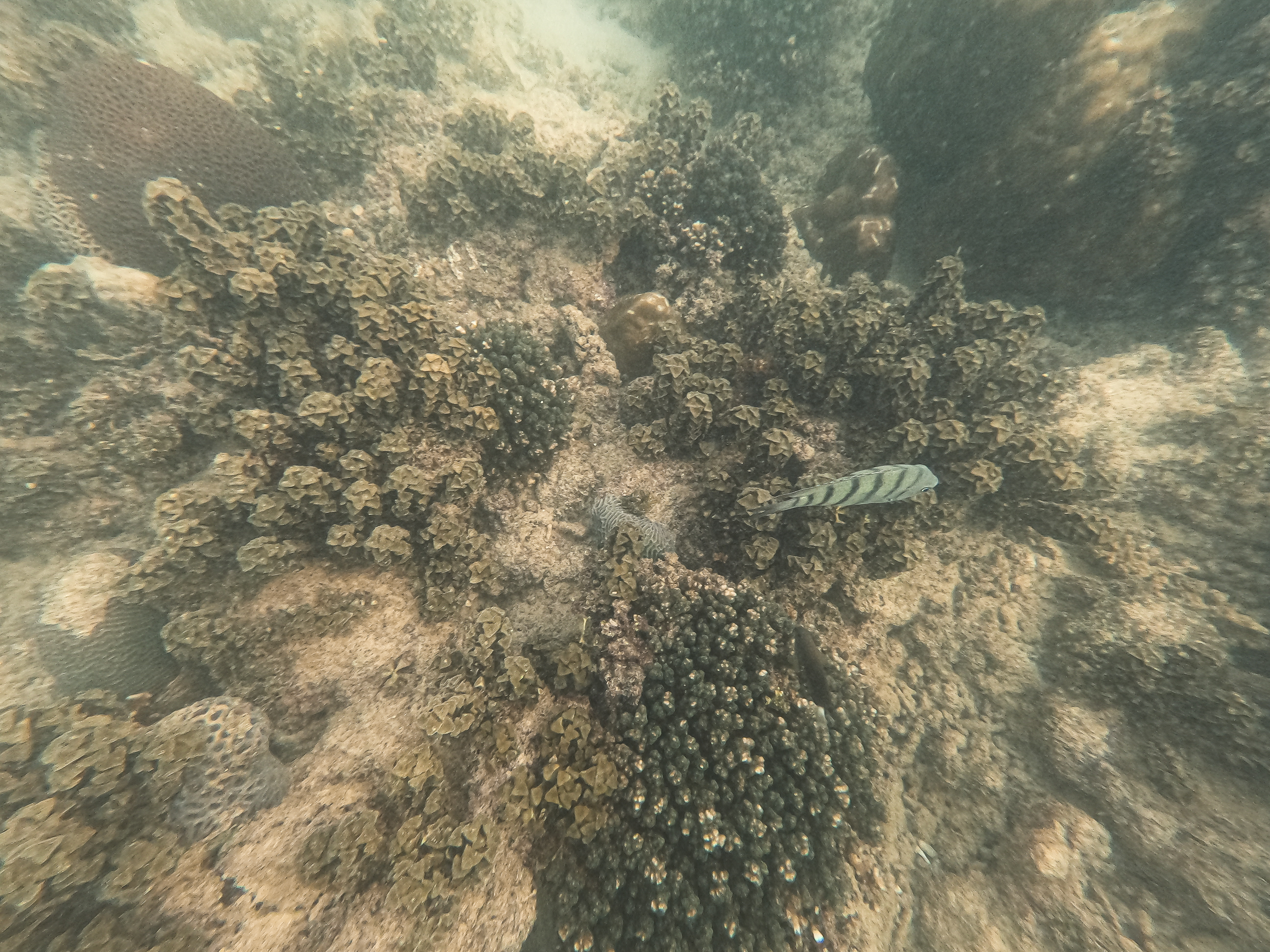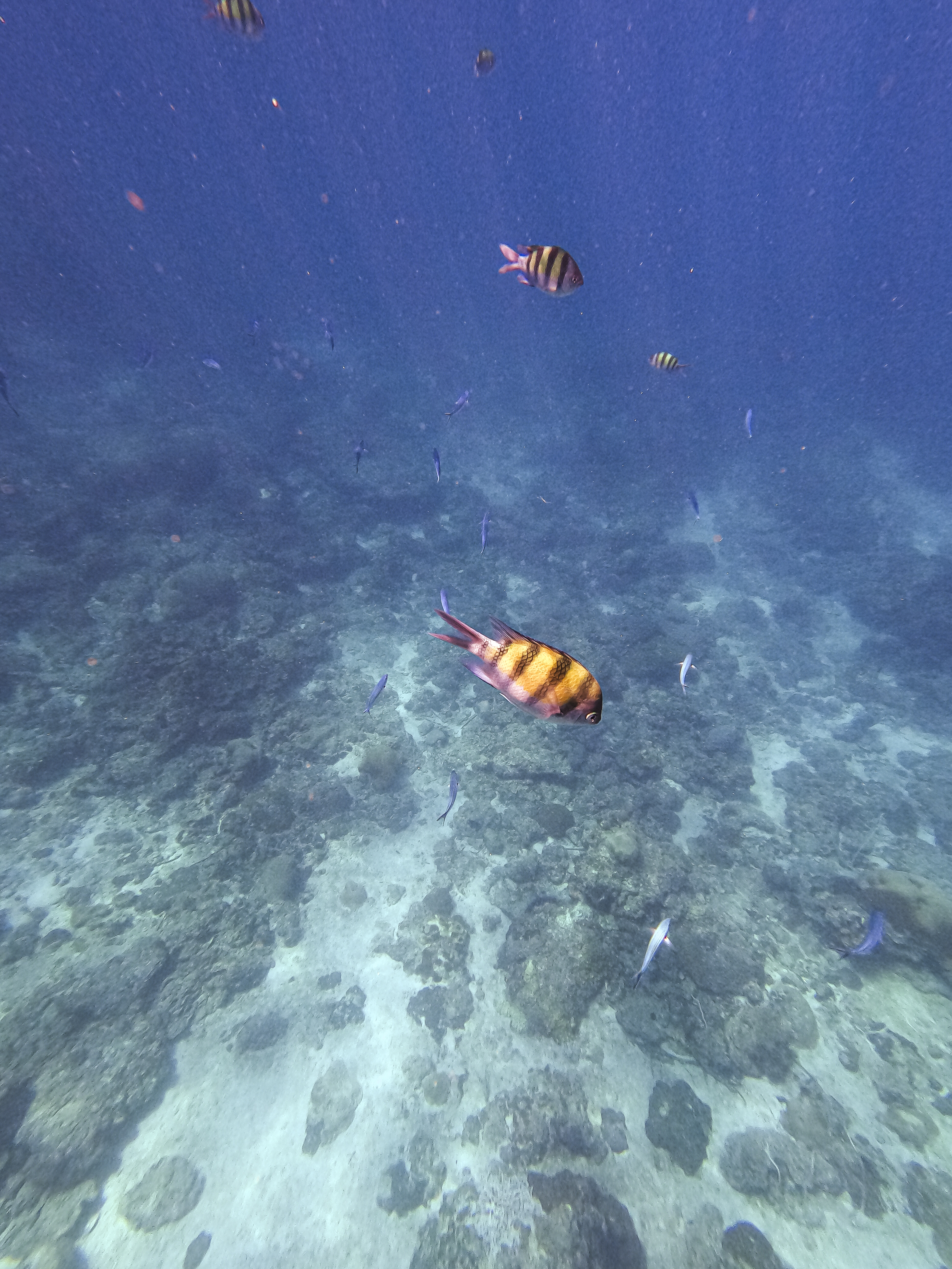 Depois, tivemos a primeira parada para snorkeling e observamos vários peixes e uma água bem transparente, apesar do intenso movimento de barcos na região.
