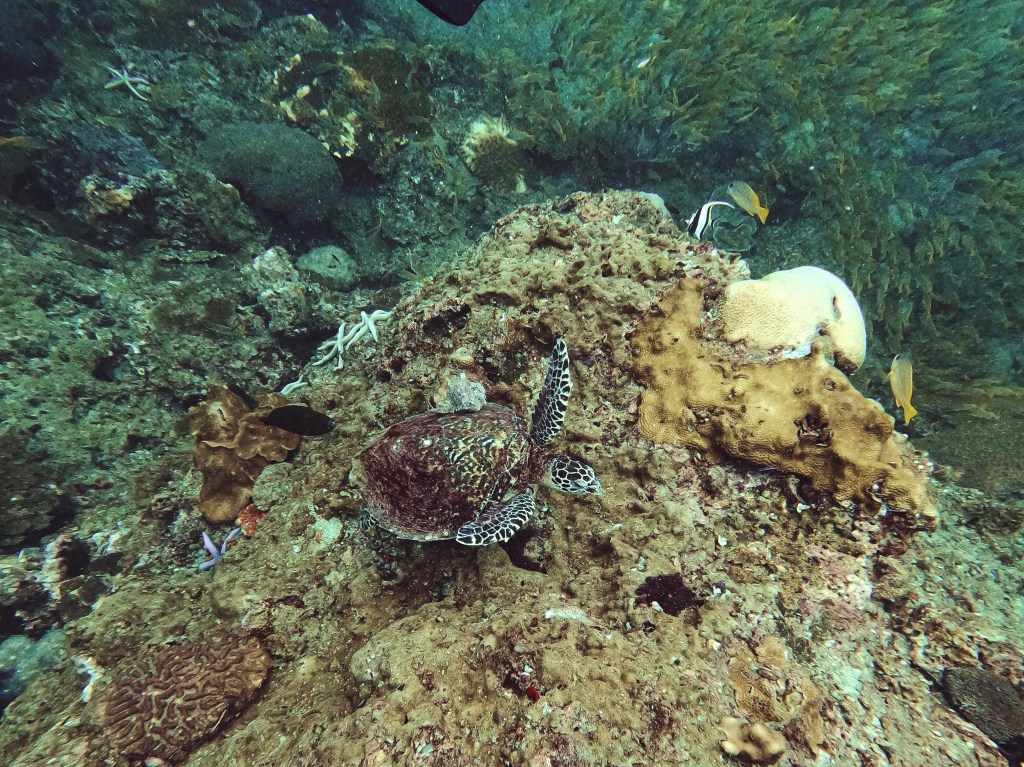 Foi uma baita experiência, pois agora não tínhamos que treinar e testar as habilidades do curso. Foi só curtir a paisagem embaixo d’água e praticar a flutuação, algo com que ainda não estamos acostumados. E, realmente, a visibilidade estava bem melhor nesse lado da Tailândia, o que nos permitiu observar peixes e corais de tudo que é tamanho e cor, além de duas tartarugas de pertinho e três tubarões à distância. O Sudeste Asiático que se prepare para esses dois novos viajantes mergulhadores!