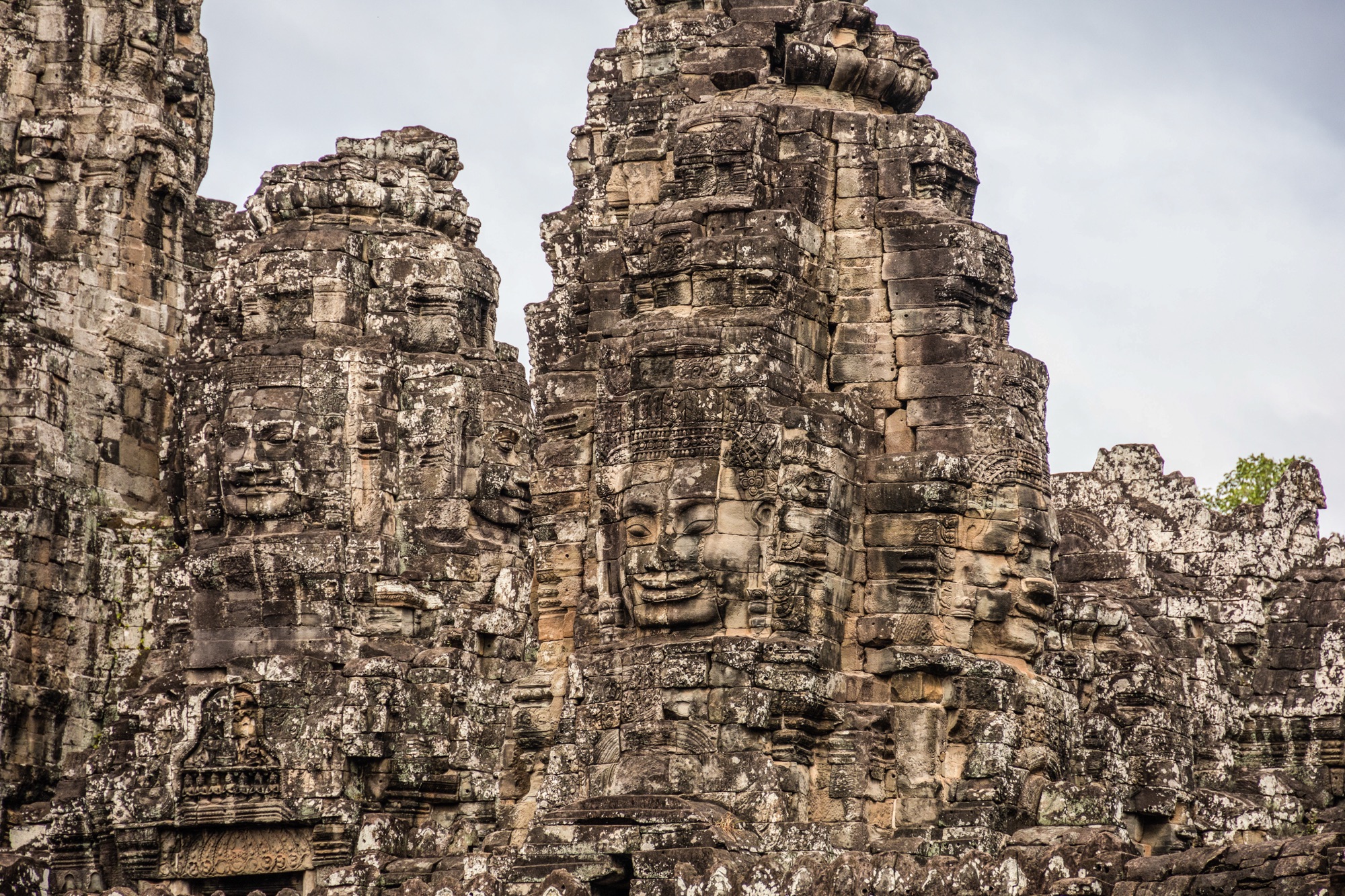 Assim, as duas religiões se mostram presentes por todo o complexo de 9 km². Nossa visita começou pelo templo Bayon, o templo estatal conhecido pelos rostos entalhados nas colunas. Originalmente, eram 54 torres (o mesmo número de províncias), com quatro rostos cada, o que dá 216 no total. Se você somar os algarismos, vai dar nove, número importante para o budismo.