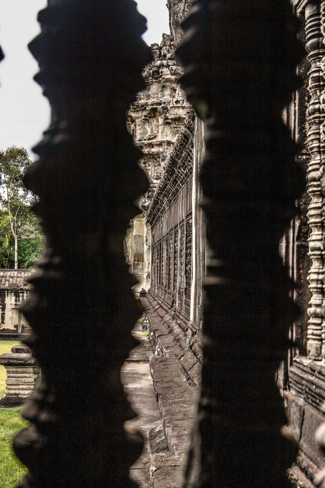 O labiríntico templo data do fim do século 12 e hoje abriga muitos morcegos. Na entrada, painéis mostram a história do Império Khmer, com lutas, festas, caça e pesca.
