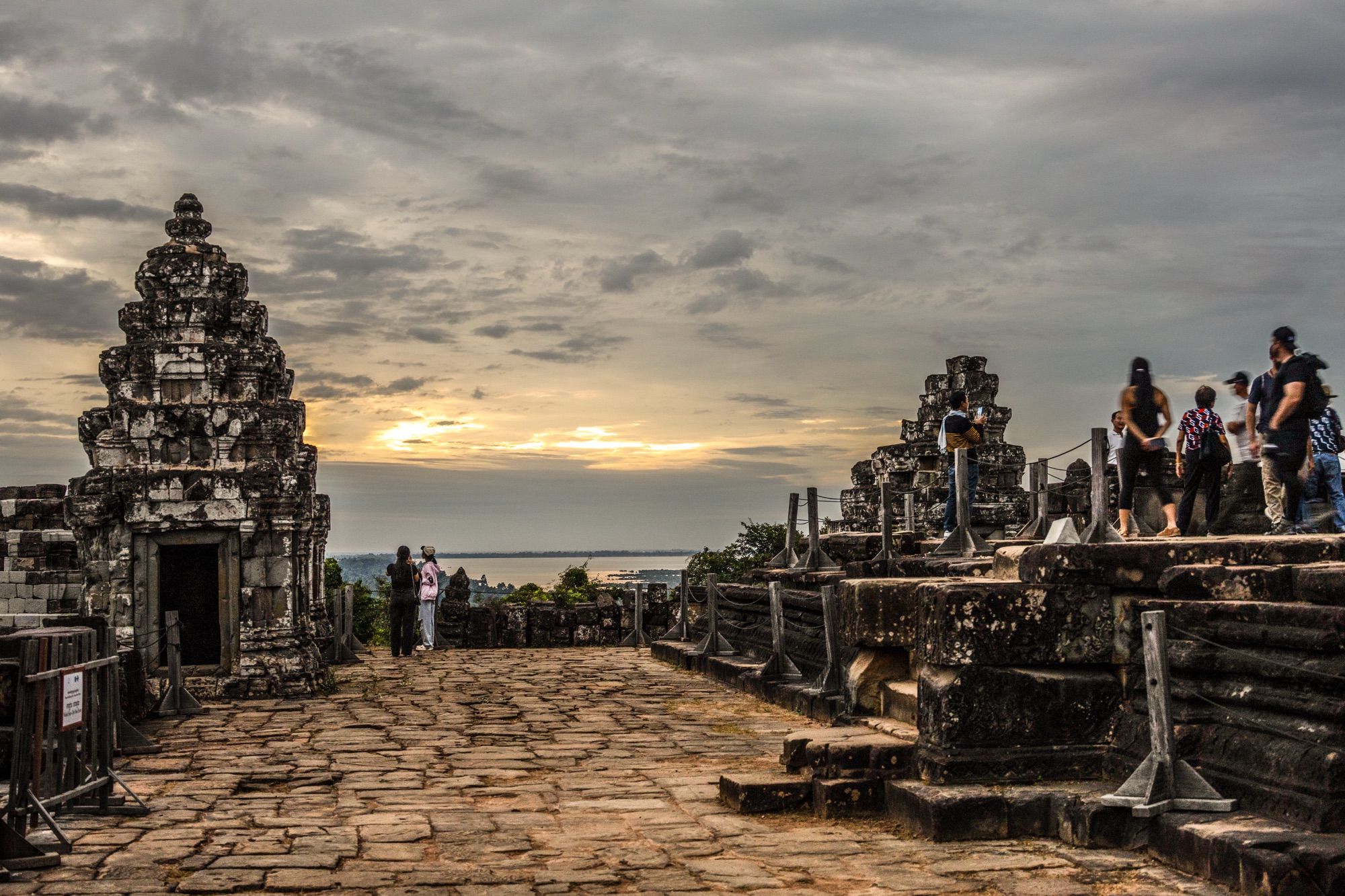 Pode-se passar muitas horas observando tudo, mas ainda tínhamos mais uma parada: o pôr do sol no morro Phnom Bakheng. Lá no alto, há mais um templo, mas o sol estava tímido, e apenas o Faraó admirou a vista do ponto mais alto (eu até subi o morro, mas deixei a escadaria só para ele).