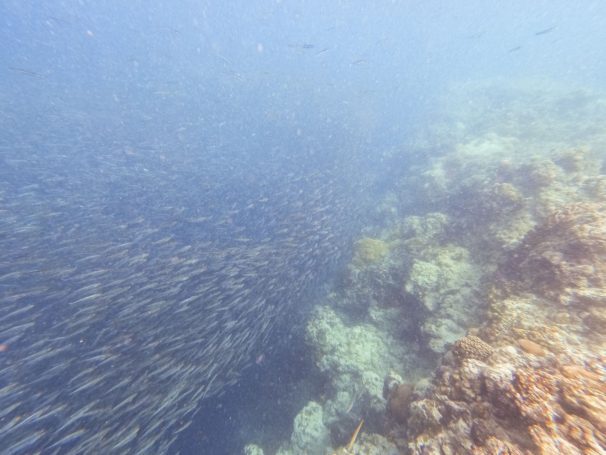 Em uma das nossas idas ao centro, de moto (₱ 500/R$ 54,50 o aluguel por dia), aproveitamos para observarmos as sardinhas. E são muitas, hein! Não precisa andar 15 metros e lá estão elas. Só é preciso atenção que, nessa região, é difícil encontrar faixa de areia. Normalmente é um trecho de corais ou pedras, e sapatilhas aquáticas são altamente recomendáveis.