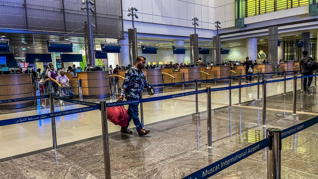 O voo da Oman Air foi tranquilo e pousamos no vazio Aeroporto Internacional de Mascate após 3 horas. Lá, um inesperado revés.
