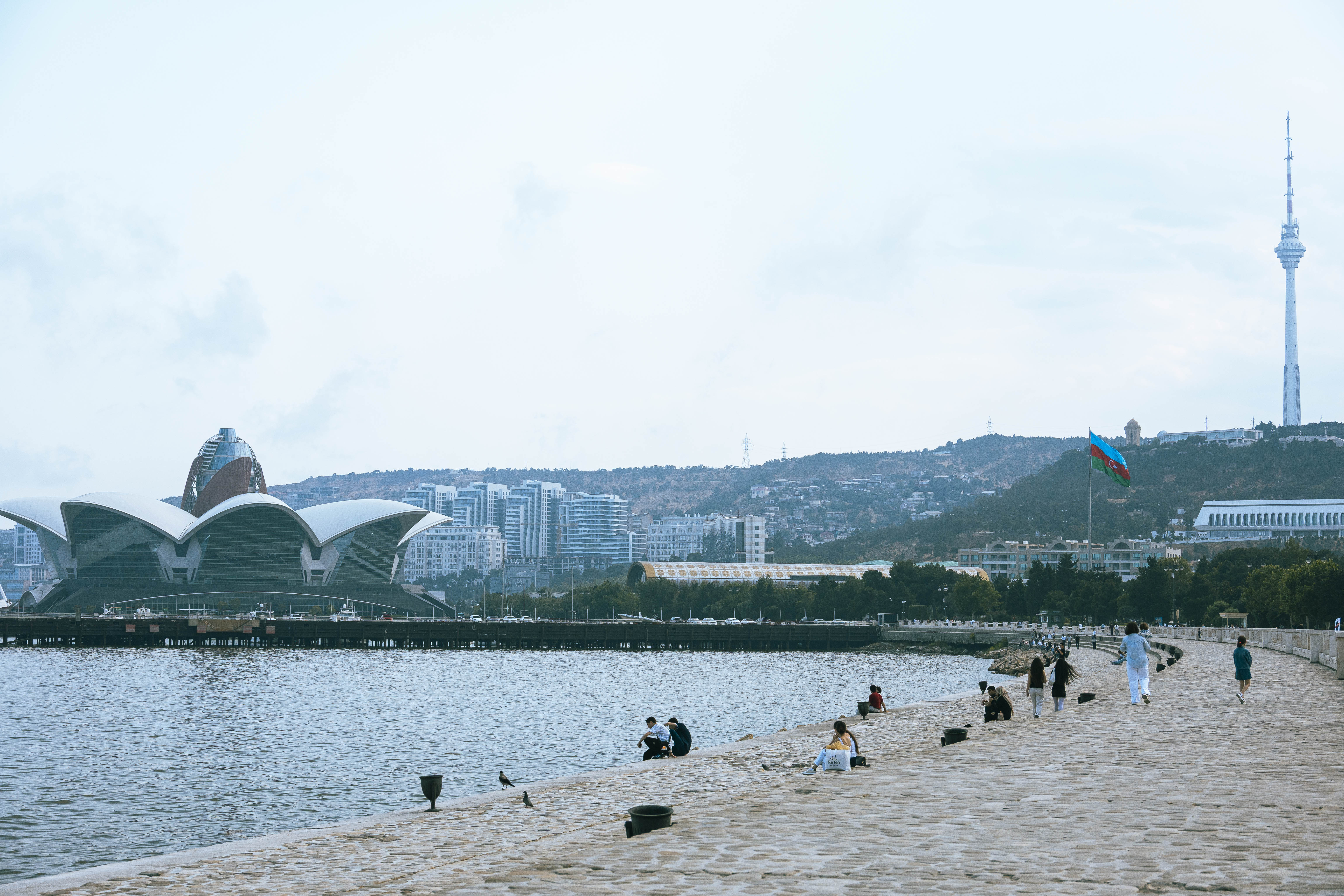 Em junho, período de bastante calor, era possível ver as pessoas aproveitando o largo calçadão da orla do Mar Cáspio durante o dia. Além de quiosques de sorvete e de tiro ao alvo, o lugar é endereço do Museu do Tapete do Azerbaijão (₼ 10/R$ 34,50).