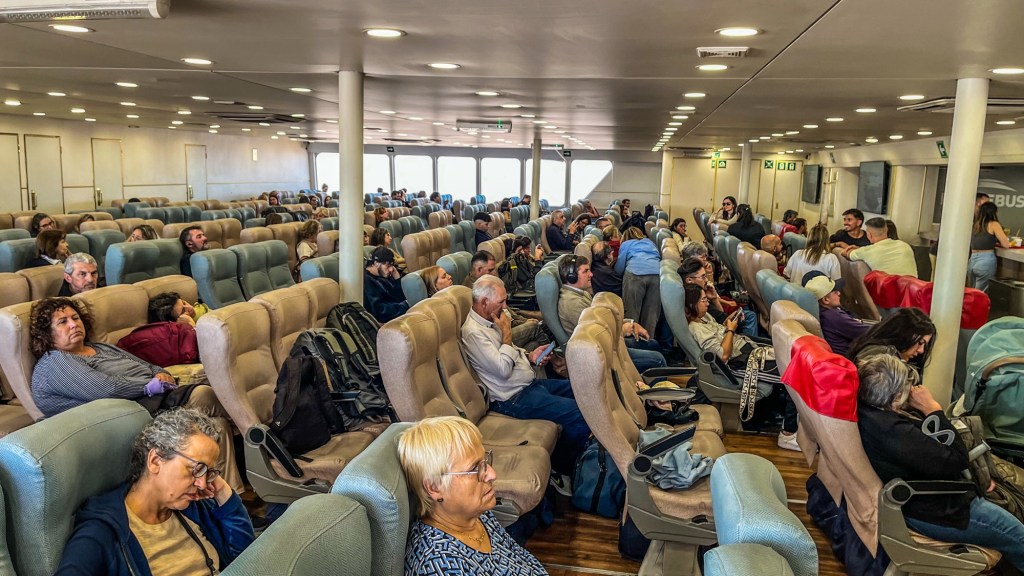 O ferry oferece uma loja e cafeteria, além de Wi-Fi pago. A viagem em si foi bem tranquila e o rio da Prata não estava revolto. Até nos lembrou quando viajamos assim entre Dar es Salaam e Zanzibar, na Tanzânia.